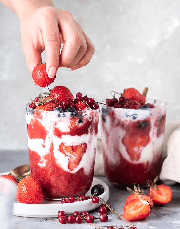 3. Fordel lagvis i et glass. Topp med jordbær og andre bær.